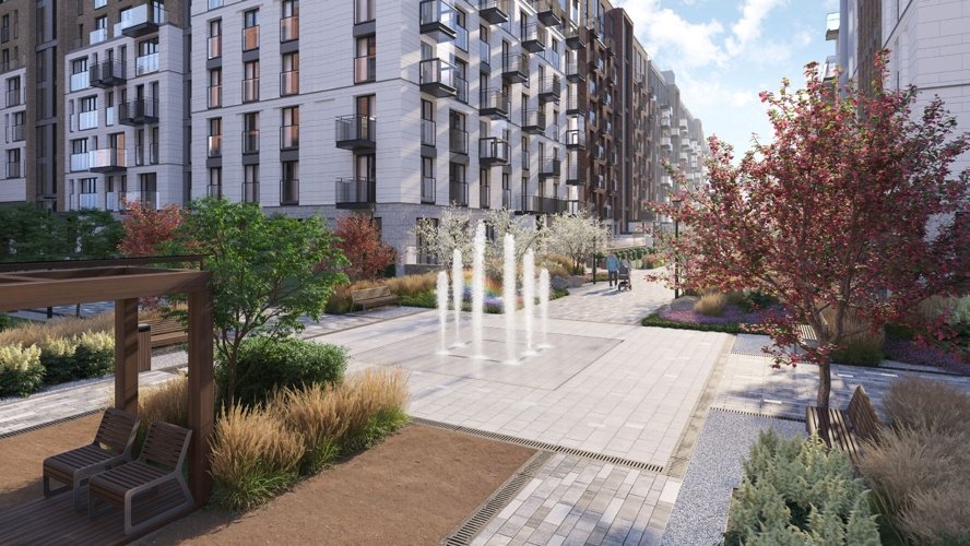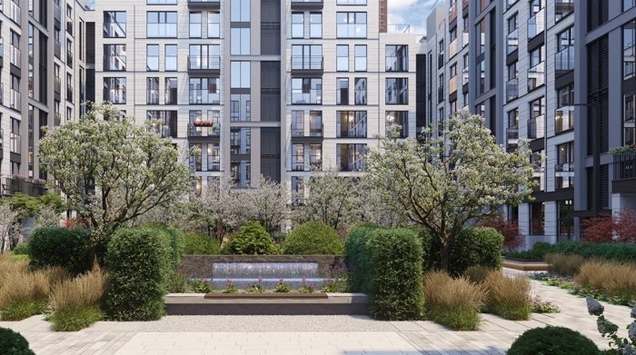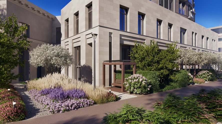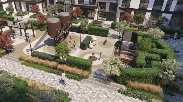 Приватные дворы без посторонних с зелёными гостиными, зонами отдыха и прогулочными маршрутами.