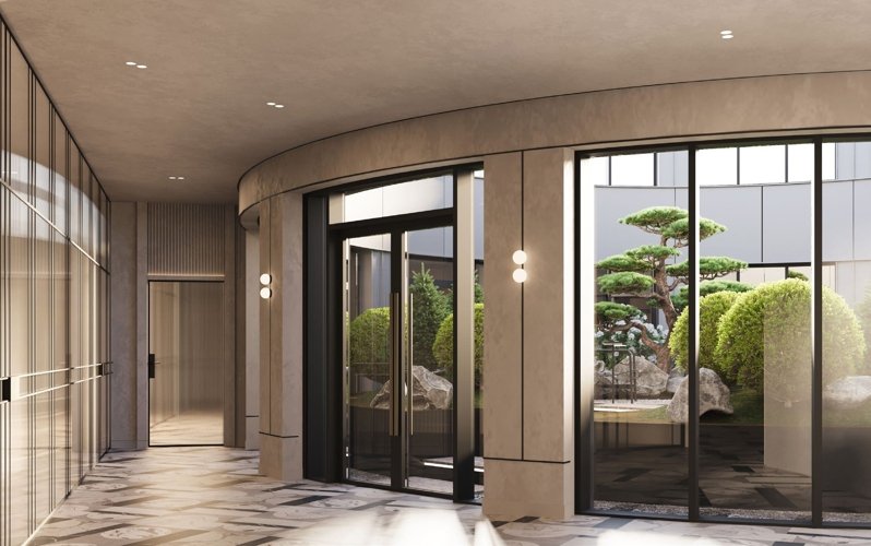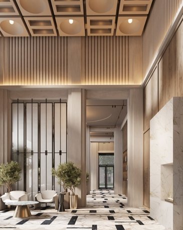 Входные группы с высокими потолками, натуральными материалами и лаунж-зонами.