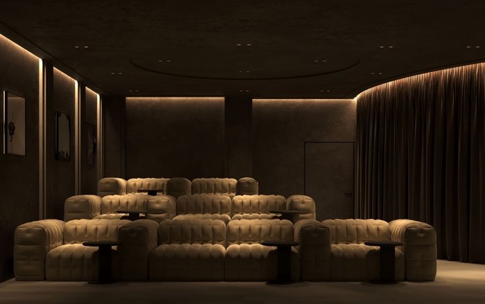 Приватная инфраструктура: гостиная с камином и роялем, кинотеатр, фитнес, хаммам, коворкинг и сад.