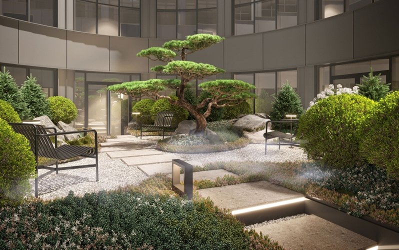 Камерный сад в японском стиле, фонтан, перголы и прогулочные бульвары внутри квартала.